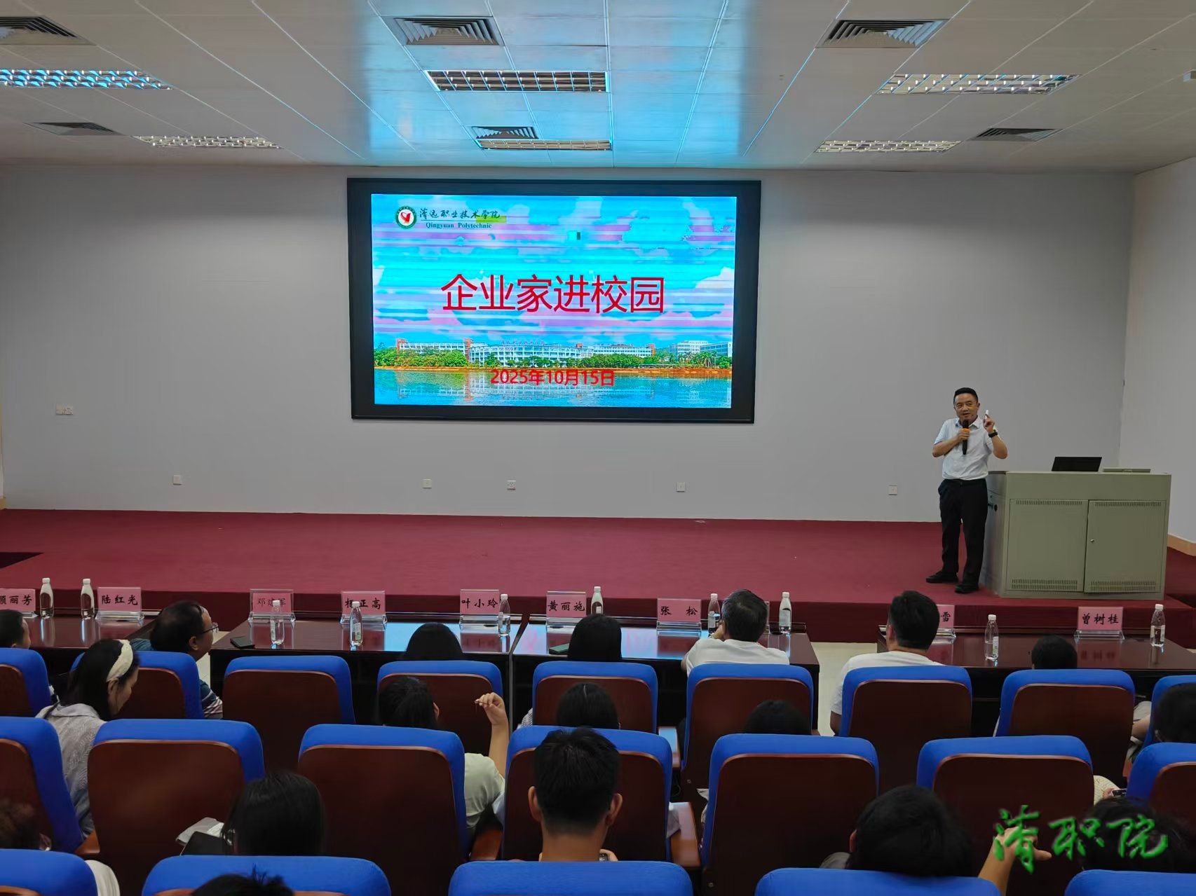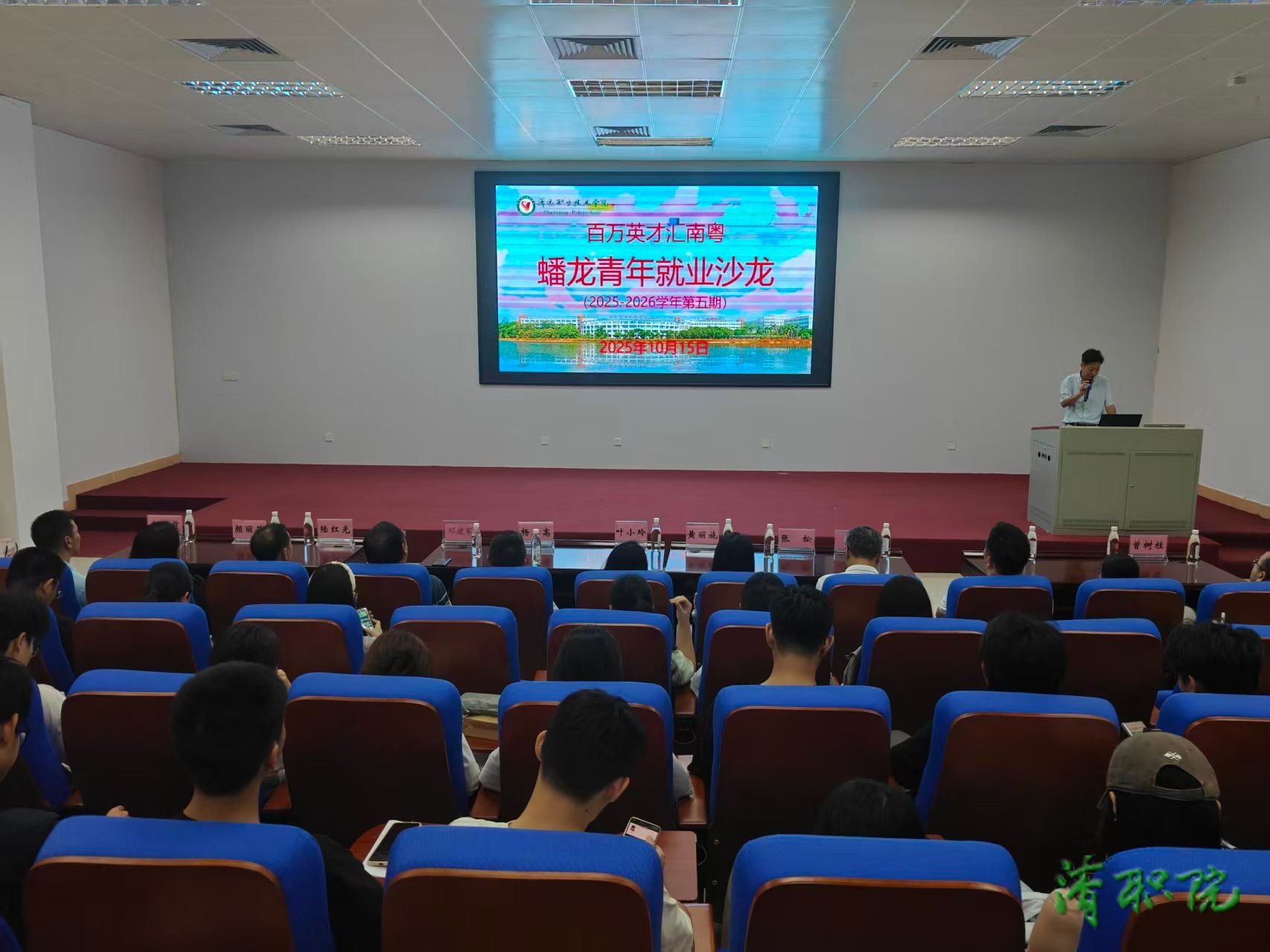 10月15日,清职院举办市域产教联合体就业创业讲座暨第五期“百万英才汇南粤”蟠龙青年就业沙龙活动。学院副院长叶小玲出席活动,广东聚石化学有限公司党总支书记杨正高、人事经理黄丽施、学生工作部和各二级学院负责人、学院师生300多人参加活动。